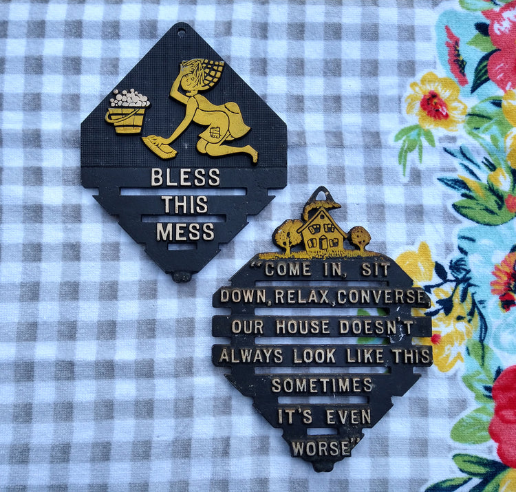 Set of 2 Small Cast Iron Black Trivets Tree Fruit Floral Scrolls